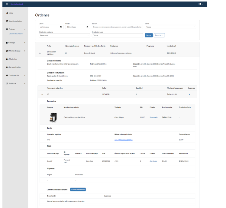 3. Dentro de cada órden podrán ver todos los datos del cliente, de facturación, del producto y del envío.