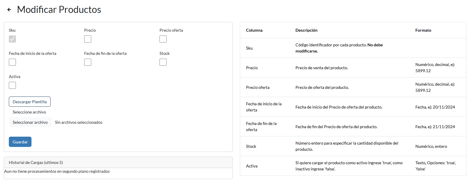 3. Deben seleccionar las casillas de los campos a modificar y hacer clic en “Descargar Plantilla”. En el lado derecho del menú tendrán un detalle de cómo completar cada campo del archivo.