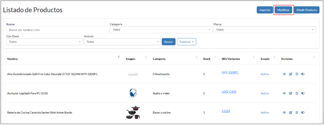 2. Dentro del listado de productos, hacemos clic en “Modificar” para ir al menú de importación de productos.